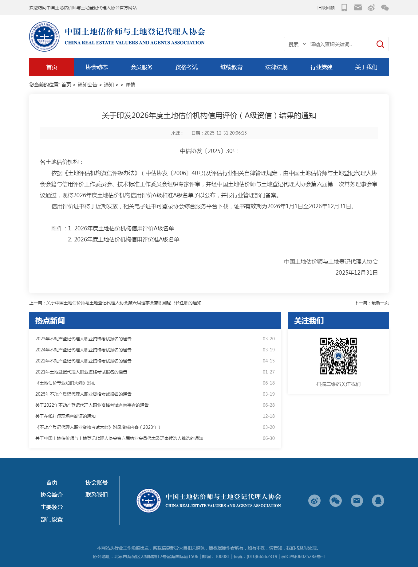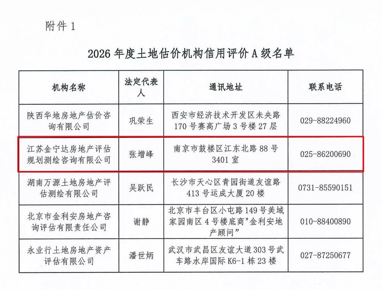 12月31日,中国土地估价师与土地登记代理人协会(以下简称“中估协”)发布了《关于印发2026年度土地估价机构信用评价(A级资信)结果的通知》,在这次全国评选出的119家A级资信土地估价机构中,我公司排名全国第二、江苏第一!自2007年起,公司连续十八年被评为“A级资信土地估价机构”。